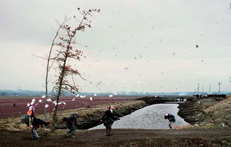 Wall’s photo echoes Hokusai’s print in many ways. There are the same two spindly trees; there are four figures, including a woman who has had a shawl wrapped around her face by the wind, while a portfolio of papers is sent flying. There is also a man who watches his hat disappear into the heavens. The major absence is Mount Fuji, which looms picturesquely in the background of Hokusai’s composition. In Wall’s version, the background is a blank wasteland of flat earth and hazy, polluted sky, broken only by a few telephone poles and the distant outlines of factories.