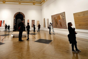 The show begins with a dreary video of Shaun Gladwell riding his motorbike through the desert, arms outstretched in ‘crucifix’ fashion. We step to the left, into a room filled with large Aboriginal paintings. Having absorbed the indigenous artists’ spiritual claim on the land we plunge into the art of the white occupation, with rooms containing colonial era works by figures such as William Westall, John Glover, Conrad Martens and Eugene von Guérard.