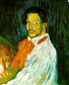 The young Picasso portrays himself in the year he left Barcelona for Paris. He stares out at us with excitement and determination, his face illuminated against a dark background. Not only did Picasso have hair in those days, he even sported a wispy moustache. He is a typical Bohemian, set to enjoy the impoverished artist’s life, intent on making his mark on the art capital of the world.