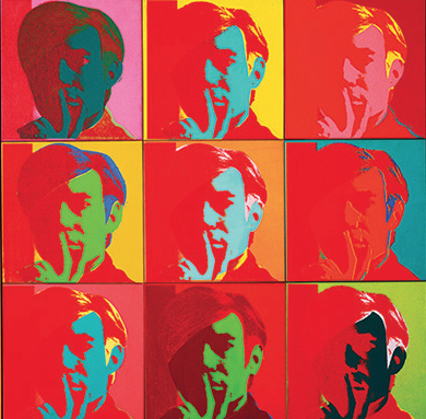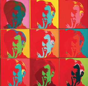 With Warhol, Hauptman reminds us of his famous comment “I want to be a machine”. Arriving at the tail end of the modernist era, in New York, the city that stole Paris’s crown, Warhol aimed to dissipate the aura of the unique work of art and the artist’s hand. One thinks also of his comments about how art should be as reproducible as a can of Coke, which is the same product for the President of the United States or a bum in the street. His self-portraits are only distinguished by variations in colour. With a block of Campell’s soup tins, only the varieties on the labels are different.