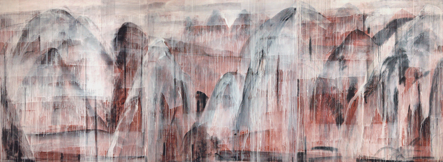 In later works such as The Language of Mountains is Rain (2005), Nivison has thinned out his preferred palette of red, black and white, to create a dream-like vista of a mountain range wreathed in cloud. The scene is vaguely reminiscent of the mountains in Chinese literati painting, which Nivison may have seen in an exhibition of pictures from the Shanghai Museum held at the Art Gallery of NSW in 2004.