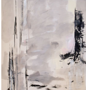 The abstract elements of Nivison’s work are prominent in all parts of this exhibition, reaching a crescendo in pictures such as Vestige (2011), in which a few spidery black lines struggle to escape from a misty cloud of white; and in epic works such as Chaconne (2009) or Fallen (2007), where paint is applied to the canvas in repetitive, vertical bands that suggest musical cadences. The reference to Bach’s Chaconne is not coincidental, but neither does it provide a vital key to the work.