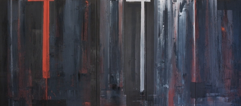 Fallen alludes to the Stations of the Cross, another favourite motif for McCahon, but one may also read this painting as a depiction of a forest, where a mighty tree has toppled over.