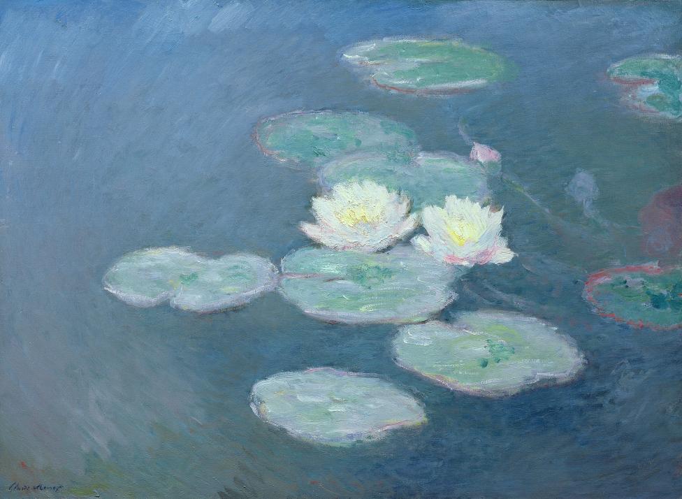 Monet did not begin to paint his waterlilies until 1897, when the plants had established themselves. The earliest example in this show, Waterlilies, evening effect (1897), is a relatively conservative picture, showing two white flowers floating on a field of lavender-grey.