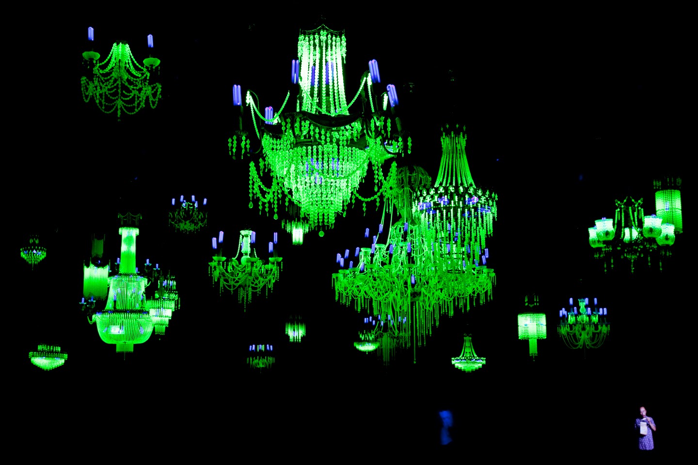 The sole Australian contribution to the Biennale is Crystal Palace by Ken + Julia Yonetani, who have placed 31 eerie green chandeliers in a darkened room to represent the 31 nuclear nations of the world. None of these nations, incidentally, are to be found in South-East Asia.