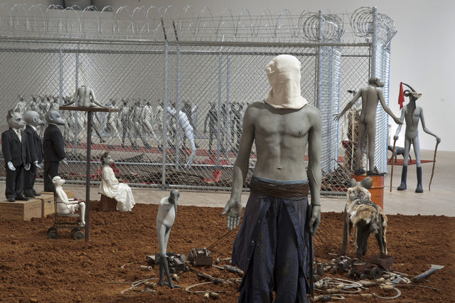 For instance, the largest installation in the show is Urs Fischer’s room-by-room simulation of his former New York apartment in which walls and contents are photo-reproduced on wallpaper. As there doesn’t seem to be anything especially political about this apartment – unless Fischer is critiquing his own bourgeois tastes – we can only assume it stands for the “house” section of the show.