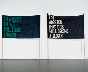 Raquel Ormella, I’m worried this will become a slogan, 1999–2002, Double-sided banner, sewn wool and felt, 220 x 200 cm