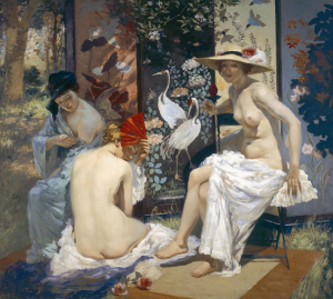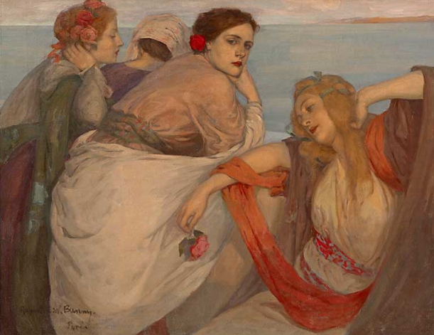 Bunny might have raised an eyebrow at such an infelicity, for although he was capable of occasional crimes against good taste, at his best he is the most elegant and sophisticated of stylists. He is especially refined in a beautiful, Whistlerian portrait of the Japanese actress, Mme Sada Yacco (1900); but also in pictures of feminine beauty such as Endormies (c.1904) and The Sun bath (c.1913).