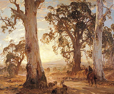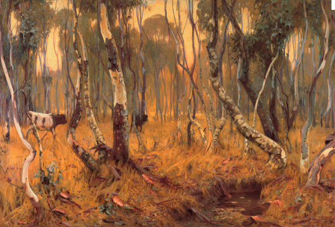 This may be why Mystic Morn, painted while still in his early twenties, remains Heysen’s most original contribution to Australian art. At this time he had only just returned from four years’ intensive study in Europe, and was still fired up by everything he had seen. Consequently, there are elements of Symbolism and Art Nouveau in Mystic Morn, with its ghostly saplings twisting and turning in the crisp, dewy atmosphere of the breaking day. When Heysen comes to paint his later masterpieces such as Red gold, he has sacrificed style for a more exacting form of observation. Yet there is still an idealised, heroic dimension to the work, as if the mighty gums looked down upon humanity like primordial sentinels.
