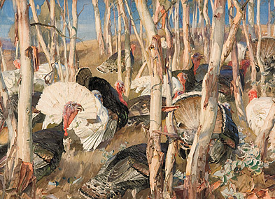 It is perhaps as a watercolourist that one sees Heysen at his very best. His brilliant study of turkeys, Bronzewings and saplings (1921) is far superior to an oil painting of the same theme. Gums under mist (1917) is a miracle of pale translucent washes, while in Flinders works such as Aroona (1939) or Land of the Oratunga (1932), we find him drawing close to the flat, decorative, Modernist approach that he normally eschewed.