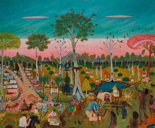 Fardoulys painted his reminiscences of travelling around the countryside, but also historical and Aboriginal scenes, religious subjects, and fantasy landscapes with dozens of exotic birds. His masterpiece is probably Blue Roses(1964), which was initially titled Betty the Barmaid, and resembled his own version of Manet’s A Bar at the Folies- Bergère. When Fardoulys imagined that Betty Churcher disapproved of the subject he transformed the bar into a florist shop. Yet somehow, it still looks just like a bar, with a sultry, dark-haired Greek barmaid standing in for Manet’s blonde Parisienne.