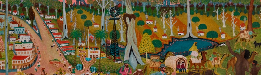 Almost immediately, his bright, colourful pictures won him admirers, including Roy and Betty Churcher, and Barry Humphries. Looking at this collection of almost fifty works, blissfully free from conventions such as perspective, happy to jumble historical fact with fantasy, the appeal of Fardoulys’s work is undiminished. It may be the departure of Burke and Wills, or a portrait of his cat, Doula, but Fardoulys approaches every task with the same love of “depth and clarity”. No matter how distant the details, Fardoulys captures them with as much precision as anything in the foreground. The most important figures in a picture are usually much larger than their neighbours.