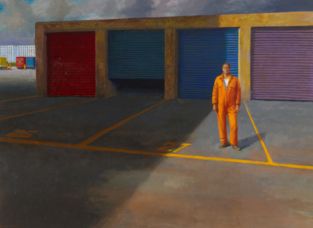 Smart takes great delight in these frozen moments. He also enjoys revisiting his back catalogue, dusting off old motifs and bringing them out for a second look. In this show, which gives the strong impression of an elderly artist looking back on his life, he has a number of paintings that self-consciously echo earlier works. The Portrait of Bruce Beresford is the most obvious. Not only has Smart put his subject in overalls, as he did with David Malouf in 1980; he also includes the coloured roller doors from a 1982 painting called Four closed shops. The latter were emblazoned with the names of well-known Italian artists, making a wry comment on the nature of the local art scene. In the new picture, the ‘closed shops’ presumably refer to Beresford’s difficulties in getting Hollywood to back his recent film projects.