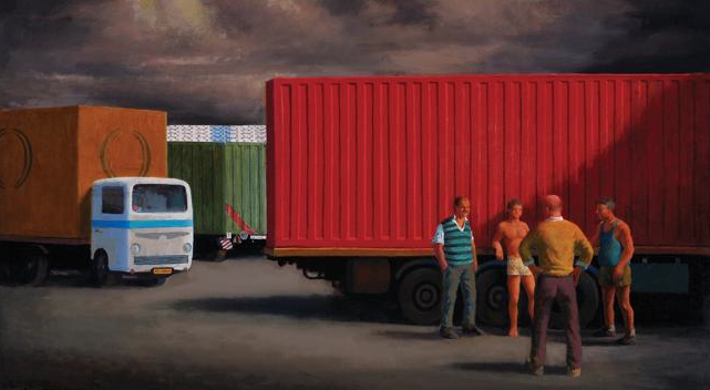 The counterpoint to this motif is the wall or billboard covered in graffiti or torn, peeling posters. If the apartments denote the deadening uniformity of urban planning, the graffiti shows how individualistic impulses will inevitably bubble to the surface. A whispered dialogue between order and anarchy underpins most of these pictures, adding to that sense of truncated narrative. Something is always about to happen. Something’s got to give. This can be a simple sequence of time and motion, as in Civitella, where a truck is just about to disappear over the crest of a hill. The conversation – a very cinematic title – presents a more complex scenario, as we have no way of knowing what four men at a truck stop are talking about, or what will be the result of their exchange.