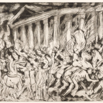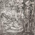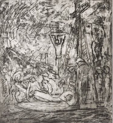 Some might feel that Kossoff’s vigorous graphics are a travesty of the Old Masters, but one could just as easily see these works as the sincerest form of homage. In these prints and drawings he tries to put himself into the shoes of Rembrandt or Poussin, working through the elements of a picture in such a way that hidden problems and deeper meanings are revealed. The Old Master paintings are not treated as historical artefacts but living entities, as vital today as they were when first exhibited.