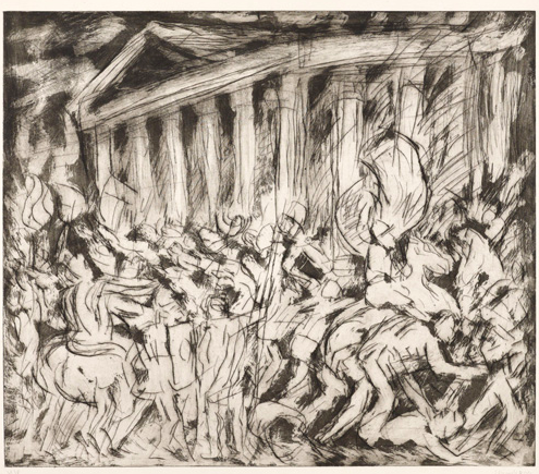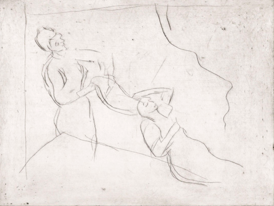 In Kossoff’s drawings the Neo-classical compositions of Poussin are broken down into component atoms, dancing madly across the page. In his response to Degas’s La Coiffure (‘Combing the hair’), the original canvas with its deep, saturated red, has been captured in a mere handful of lines scratched uncertainly onto an etching plate. At first this seems to do violence to the original image, but gradually one realises that Kossoff has made us look at this picture in an entirely new way. By removing the colour he shows how little there is to the composition – a simple diagonal movement, as the maid pulls back a great handful of the woman’s hair. We see how the sensuousness of the original painting refers to the feeling of having one’s hair brushed, with Degas using the red haze to capture a tiny moment of abandon. That red is a smokescreen, banishing all other impressions.
