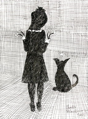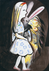 And so, when the elderly Blackman, looking surprisingly healthy and spruce, decides to show his recent drawings, it is a tantalising prospect. The results are child-like but canny, with unsettling traces of wit. Look at the way the arm wraps itself around the guitar in the nude study, Serenade, or the way the line of the model’s hip seems to bisect her other arm. In Still life with window, a tiny window with curtains is inserted into the front of a vase. In Heading towards kosiowsko (sic), Alice wears spurs, while her companion, the Rabbit – or March Hare? – has black bands around his ankles. Both seem to have haloes, while the way Alice’s legs disappear into her skirt is a problem worthy of Lewis Carroll.