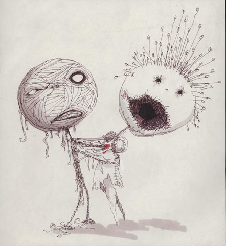 In this exhibition one sees Burton as quintessentially a cartoonist. From his earliest days drawing was the medium in which he expressed himself most fluently, where his inner life could be given free reign. He seems to have been subject to a wide range of influences, beginning with Doctor Seuss and evolving into a graphic style that has echoes of Ralph Steadman, Gerald Scarfe and Edward Gorey. From the first two, he appears to have borrowed the sharp lines and black scatological humour, from Gorey, the strangeness and melancholy.