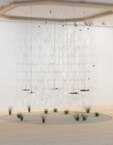 Perhaps the most surprising piece is Céleste Bourgier-Mougenot’s From here to ear (v.13), a room-sized installation that uses live finches to create music by perching on a series of special bars, chirping, and fluttering from nest to nest. This gives a peculiarly literal twist to Messiaen’s use of bird song in musical composition. In Bourgier-Mougenot’s work the birds are the composers.