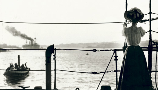 Long practice, slow exposure times, and a certain natural flair, honed Allen’s abilities to the point where he displayed an uncanny knack for composition. A 1905 photograph of his daughter, arms raised, ready to dive into a pool is masterful; as is a 1903 picture of two small boys standing ankle deep in water, staring at a flotilla of model ships. A 1907 photo of a woman looking over the railings of the HMS Powerful shows an artist’s appreciation for the dynamic play of vertical and horizontal lines.