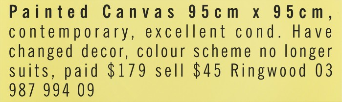Michael Lindeman is a young artist with an exceptionally sharp mind. When so much would-be Conceptual Art seems to have no idea whatsoever, Lindeman’s conceptually-based paintings are incisive and genuinely witty. Based on classified advertisements for works of art, they are as well observed as any landscape painting. The wording, at once banal but revealing, provides a timely reminder of the way the vast majority of the population approach the subject of art. They’d be depressing if they weren’t so funny.