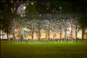 I hope to give both MCA shows more detailed consideration when the dust has settled on the opening festivities. Marking Time is a complex proposition: the latest in a long line of MCA exhibitions in which the concept is more interesting than the realisation. It includes works by international artists who deal broadly with the theme of ‘time’. The works may be conceptually acute, but they are visually uninspired. The chief exceptions are two arresting videos by Daniel Crooks; and a room that puts the hyper-patterned poles and bark paintings of Gulumbu Yunupingu alongside a new body of work by Lindy Lee. The latter consists of large sheets of paper marked with holes, and abstract patterns often created by rain water.