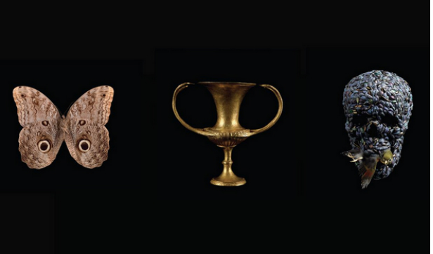 In another room is a work by Jason Shulman that consists of only a thin candle with a circular aura, created, so I’m told, by the shape of the enclosure. The twists in a shell are echoed by a spiralling arrangement of coloured beetles. The red lines of an Emily Kngwarreye painting are mirrored by a sample of red crystals. A panel encrusted with dead flies by Damien Hirst finds a cousin in a solid block of Chinese coins retrieved from the ocean floor. A waxy, elongated torso by Belgian artist, Berlinde De Bruyckere is exhibited alongside another Egyptian sarcophagus, and a Minoan burial casket from c.1300 BCE.