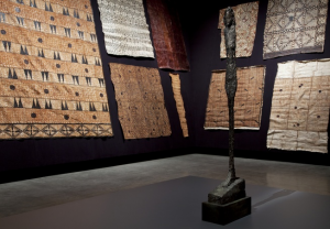 There are more than 300 objects in this exhibition, but the heart of the display is an astonishing, vault-like room draped with more than 80 antique barkcloths (or ‘tapas’), from many parts of the Pacific. Standing at one end is an Egyptian sarcophagus, at the other an emaciated bronze figure by Giacometti. All the barkcloths come from the TMAG collection, and have not been shown for years. The patterns are meaningful, but we can only guess at the stories embedded in them. The origins of many pieces, and the secrets they contain, have been lost.