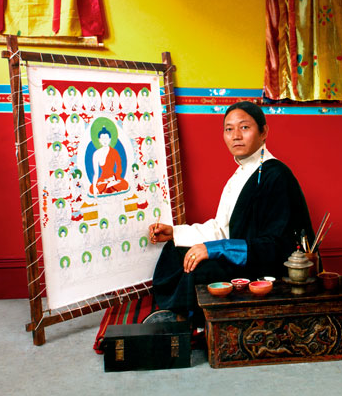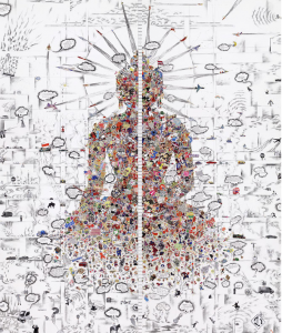Like all Tibetan artists, the image of the Buddha and the traditions of thangka painting are intrinsic to Gyatso’s work. Yet no other artist has produced so many radical, irreverent variations on the Buddha silhouette, often plastered with tiny stickers or cartoon images drawn from the chaos of pop culture. Within an icon of perfect tranquility one finds a raging, noisy inferno of comic book heroes, material goods, and snippets of current affairs. It is nothing less than new manifestation of Pop Art, arriving in the West as Maoism once did, like ‘a wind from the East’.