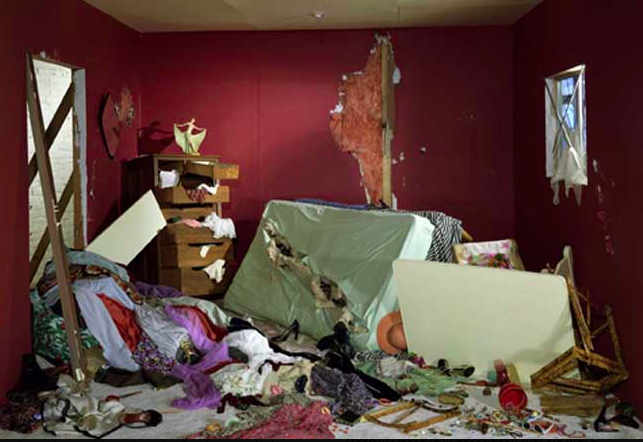 If The Destroyed Room (1978) seems vaguely familiar, try looking at it alongside Delacroix’s The Death of Sardanapalus (1827), the painting of a king who has his possessions destroyed and his wives put to death to keep them out of the hands of an invader. In Wall’s image there is no murder and mayhem, simply the aftermath of destruction. All the evidence – the clothes, the shoes and jewelry – suggests it is a woman’s room, but we don’t know whether the damage was caused by some external force or by the occupant.’