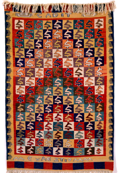 Rish reasons that these cultures have survived everything the march of progress can throw at them, so they are robust enough to withstand the intrusions of one interloper from Sydney. His predilection for humour and satire finds its way into a piece such as Prophet Motif (1994) – a Turkish carpet woven to his design, by weaver, Ayse Can, which features a coloured field of dollar signs and a border of stylised, grasping hands.
