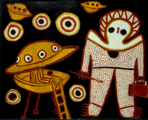 Chariots (or Webers) of the Gods (1998) is an ochre painting made with Kimberleys artist, Lily Karadada, which features a Wandjina figure alongside a barbeque that resembles a flying saucer. The reference is to Erich von Däniken’s notorious claim of 1968 that the Wandjinas are portraits of visitors from outer space.