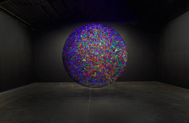 Hanging in the centre of the large upstairs gallery is a circular form composed of luminescent, brightly coloured butterflies. The gallery walls have been painted black and the lighting confined to a set of spots with UV bulbs. The apparition hovers in the air like a planet in space. When one walks around to the other side, the apparent sphere is revealed as a disc, three metres in diameter, made from thin sheets of hand-painted, laser cut steel. The verso is composed of a mesh made from hundreds of tiny beetles or cockroaches, in a uniform blueish-white.