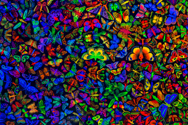 Examining the work more closely one finds the coloured butterflies are tiny human silhouettes with wings attached. Instantly, one thinks of movies such as The Fly. The work is not a representation of the natural world, but something supernatural or magical.