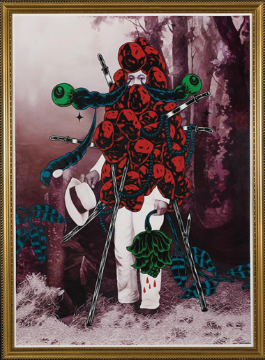 Riyadi admits to being influenced by many other artists, as well as comics, B movies and record covers. He takes the detritus of popular culture and attaches it to images with completely different origins. In his works titled Noise From the Fertile Land, he paints grotesque heads and other appendages over figures from vintage photographs. The sedate and formal appearance of colonial life is violated by these viral additions that restore all the violence and madness the original photographer avoided in his portrayals of the age.