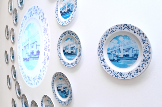 The trio, Tromarama, who specialise in animated videos, have contributed an elaborate wall installation of 30 ceramic plates, arranged in two circles around a central projection. The street scene featured in the video is commemorated in frozen details on the plates, which are painted in blue and white, like Delftware – a style originally inspired by Chinese pottery, then copied by oriental potters and exported to the European market. The animated image shows a truck and a bus passing by a nondescript modern western building, another disavowal of the concept of the ‘picturesque’ Indies. Such urban drabness is one of the legacies of colonialism around the world. When treated as decoration the incongruity is unsettling.