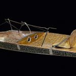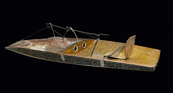 Goodwin, who refers to mathematics as “Western Dreaming”, uses formulae to create nonsense rather than sense – a fantastic over-elaboration of meaning that renders these symbols as opaque (to most of us) as Egyptian hieroglyphics. In Moth (2005) he has covered a streamlined wooden boat frame with dense calculations.