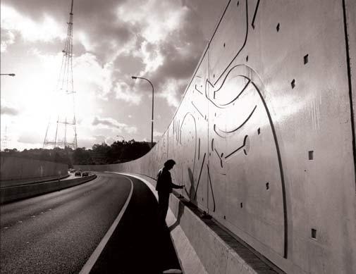 If you have driven along the Gore Hill Freeway you have already experienced the art of Richard Goodwin. The abstract patterns incised on the concrete, sound-baffling walls are taken from designs by architect, Walter Burley Griffin; the transcriptions of Aboriginal rock carvings pay homage to the area’s first inhabitants. It’s a typical Goodwin project: scrupulous in its historical references, sharply designed and executed. Although it is basically a way of adding visual interest to a concrete surface, there is an aspiration towards higher things.