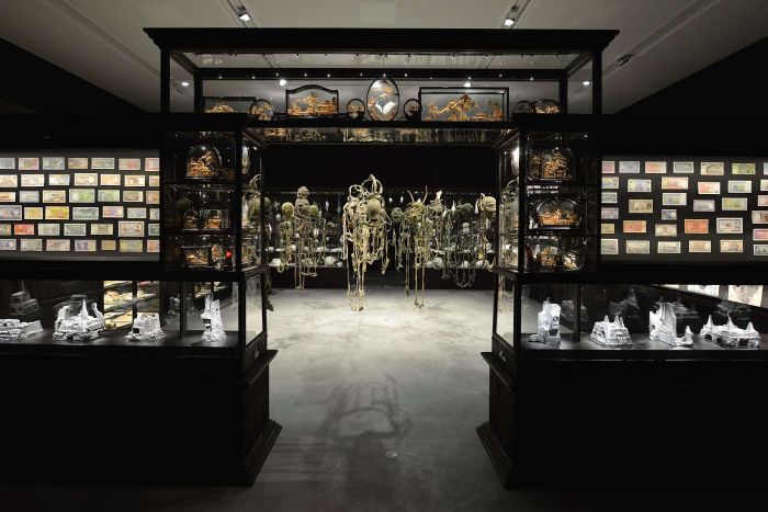 One of the original ideas was to have a white space inside the black granite cube, but featured artist, Fiona Hall, has painted the room black for an installation that is busy, complex and encyclopaedic in its preoccupations. It provides a vivid demonstration on the versatile nature of the design. The architects have done away with interior walls, creating an interior that is pure volume. Hall has exercised her right to construct a room-within-a-room, employing a square arrangement of linked vitrines.