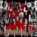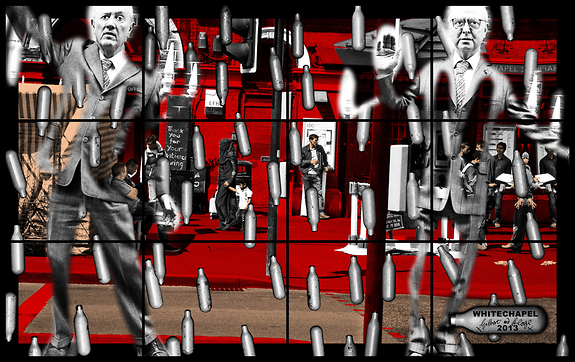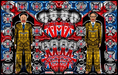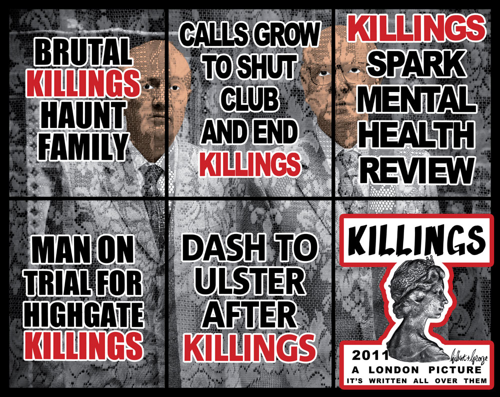 From behind a façade of consummate Englishness they set out to expose the grossness and depravity of the world around them. The Jack Freak Pictures (2008) use images of the Union Jack combined with grotesque morphings of their own figures that make them look like demons or mutants. The London Pictures (2011) use hundreds of daily newspaper banners, purloined from newsagents, to produce a chorus of sordidness and sensationalism.