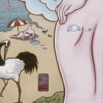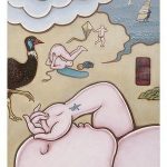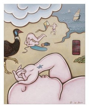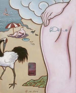 Guan Wei includes a red-crowned crane as a kind of blessing on the Australian lifestyle, even if it this bird resembles an alien life-form on the beach. In a tiny shoulder tattoo we see a figure flying a kite – a care-free image worn as a membership badge of an exclusive national club. Although those born in the Year of the Goat are said to be worriers, this characteristic is at odds with that great Australian incantation: “She’ll be right.” We need to remember that the Chinese cloud design stands for “never-ending fortune.” Long may the decadent Australian Dream persist.