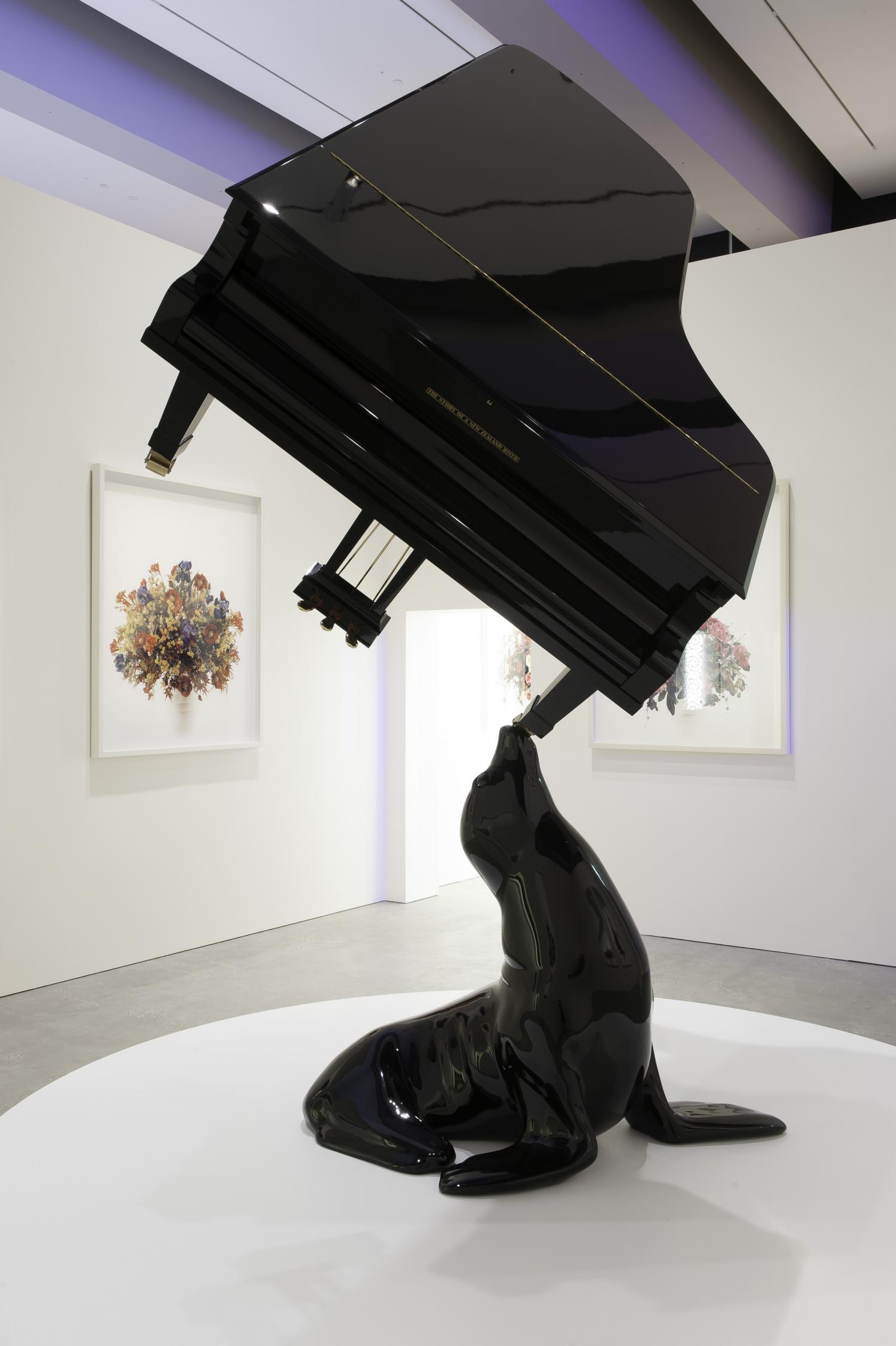 Other rooms include a full-scale Kombi bus, parked in a forest of teal-coloured tree trunks – evoking the obligatory overseas trip undertaken by young Antipodeans; a life-sized fibreglass seal balancing a piano on its nose, which refers to the map of New Zealand and Jane Campion’s film, The Piano (1993); large-scale photos of flower arrangements, each meant to commemorate a battle of the First World War; and so on.