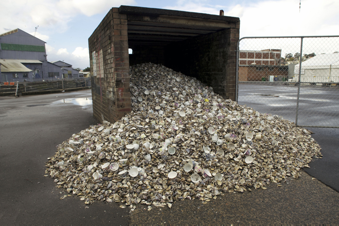 I’ve left Jonathan Jones until last because aspects of his work at MAMA have echoes in the exhibition he has produced for the Bathurst Regional Art Gallery, notably a group of mussels cast in bronze, memorialising a food source that has now been decimated.