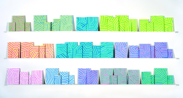I always felt the light tubes represented a game of diminishing returns, so it’s been pleasing to see the increasing diversification of Jones’s work, perhaps since his ‘oysters and teacups’ installation in the Sydney Biennale of 2012. In the Albury show he has made a piece from household sponges used to wash dishes. Covered in stripes and propped up on shelves they have the same formal neatness as the light installations, but the material sends a very different message. Compared to the severity of a fluorescent tube, a sponge is infinitely malleable.