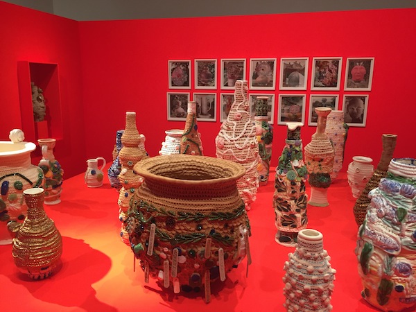 Nell is a great experimenter but certain themes and motifs keep recurring in her work. Her sprawling installation, The Wake (2014-16), features an array of pots with the smiley faces and Halloween masks we’ve seen on other occasions. The abiding inspiration is Haniwa, the ancient Japanese funerary ornaments made to ward off evil spirits. The work is cartoon gothic but remarkably up-beat.