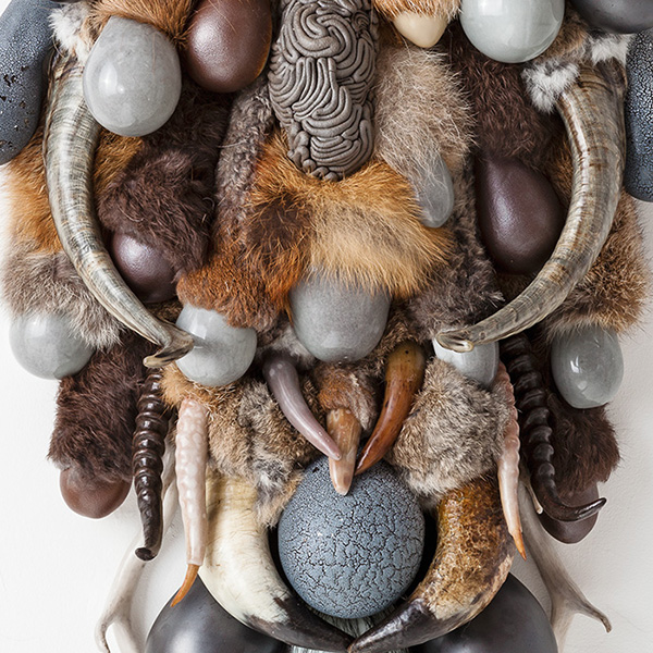 Nithiyendran’s neighbour at the Samstag is the show’s second-youngest artist, Juz Kitson (b. 1987). Kitson was an outstanding talent at the National Art School, and has grown in ambition since she started working with the potteries of Jingdezhen. Her hanging sculptures are studiously informal – made up of evocative combinations of porcelain, fur, bones, fabric, and other substances.