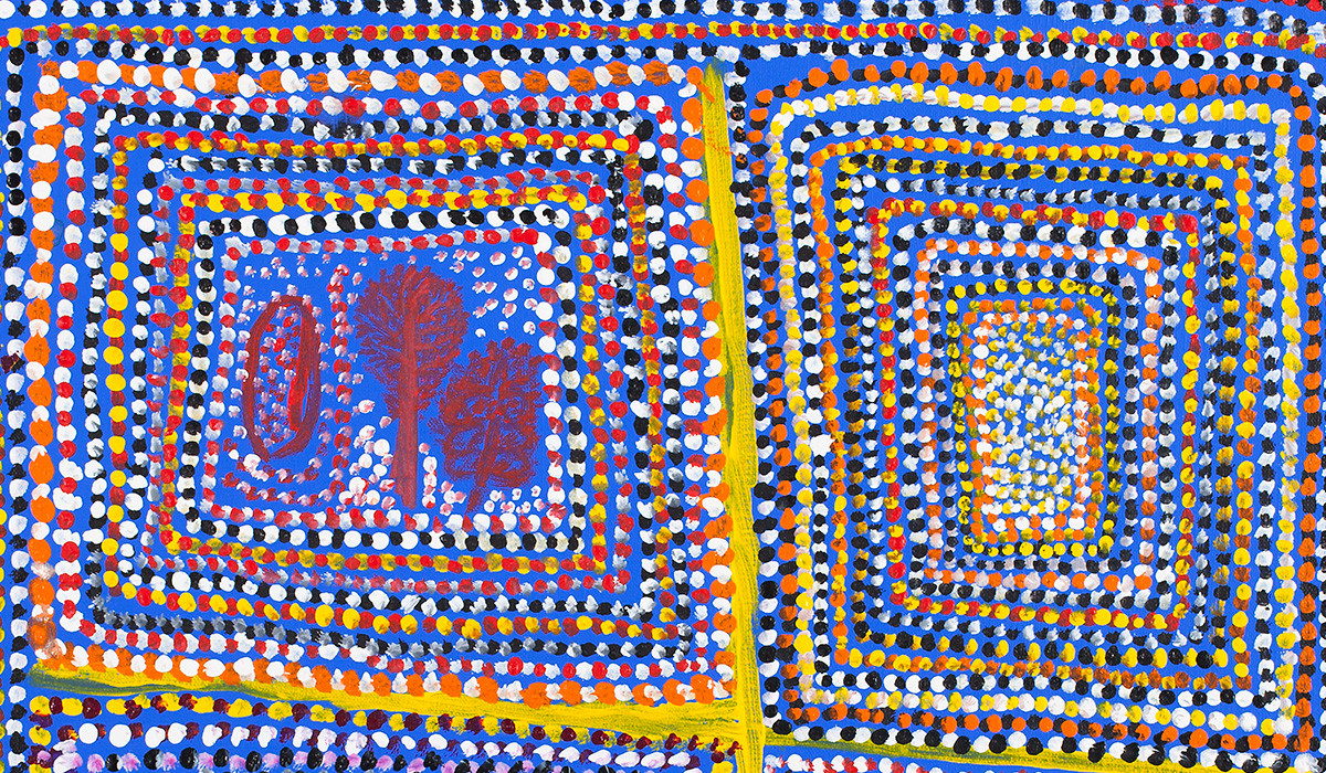 Loongkoonan, who comes originally from the remote region of Mount Anderson, W.A., is the ultimate late starter, having taken up painting at the age of 96. Her pictures chart her homeland in mesmeric, map-like patterns, with subtle variations of colour. They are slow-burners that grow progressively more fascinating the longer one looks.