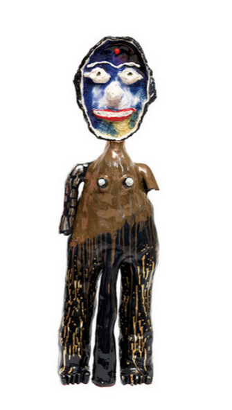 Nithiyendran was born in Colombo, to ethnically diverse parents, and came with his family to Australia at an early age. His large-scale ceramic sculptures resemble primitive idols, drawing on the iconography of Hinduism and on contemporary identity politics. They are ragged in form and fearsome to behold, but imbued with a tongue-in-cheek humour.