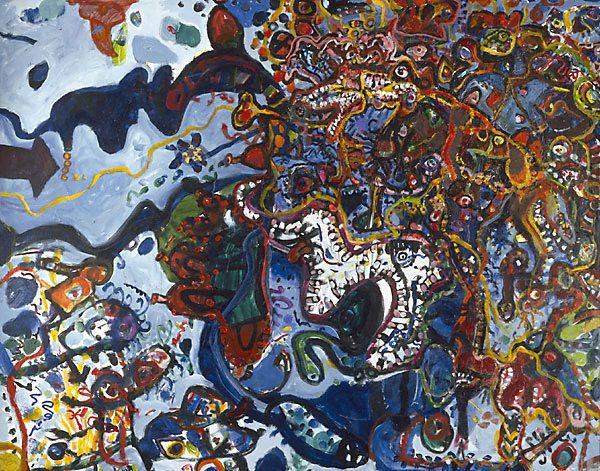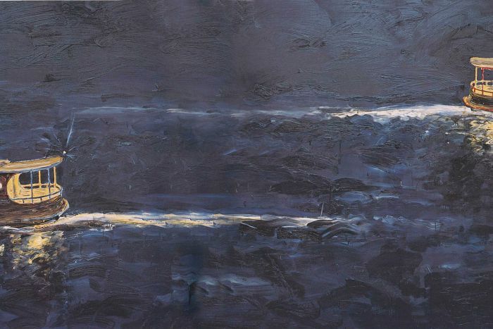 Peter Kingston sticks to the harbour like a barnacle, with every painting featuring that recognisable expanse of water complete with ferries and landmarks. Yet Kingston’s simple, descriptive style is overshadowed by Olsen’s ebullience, and Connor’s uncompromising spikiness. Where Olsen lays on the paint like a virtuoso, and Connor grapples with a canvas until he has eliminated any trace of superficial attractiveness, Kingston is happy to float along on the tide. In the large painting, Passing ferries (1999), which features on the cover of the catalogue, he has applied the paint in a perfunctory manner, simply dragging the brush across the canvas.
