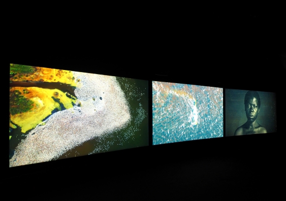 John Akomfrah’s Vertigo Sea is the flagship piece in a suite of exhibitions at the UNSW Galleries called Troubled Waters. The entire ensemble includes a 26-minute, 5-channel installation by Georgia Wallace-Crabbe called The Earth and the Elements; and a multimedia exhibition called River Journey, featuring work by Janet Laurence, Andrew Belletty, Nici Cumpston, Bonita Ely and Tamara Dean. There are static images, photos and sculptural components, but overall it’s a marathon of video. If your appetite for video art is still not satisfied you can visit the John Fries Award exhibition, also being held at the UNSW Galleries, and watch a bit more.